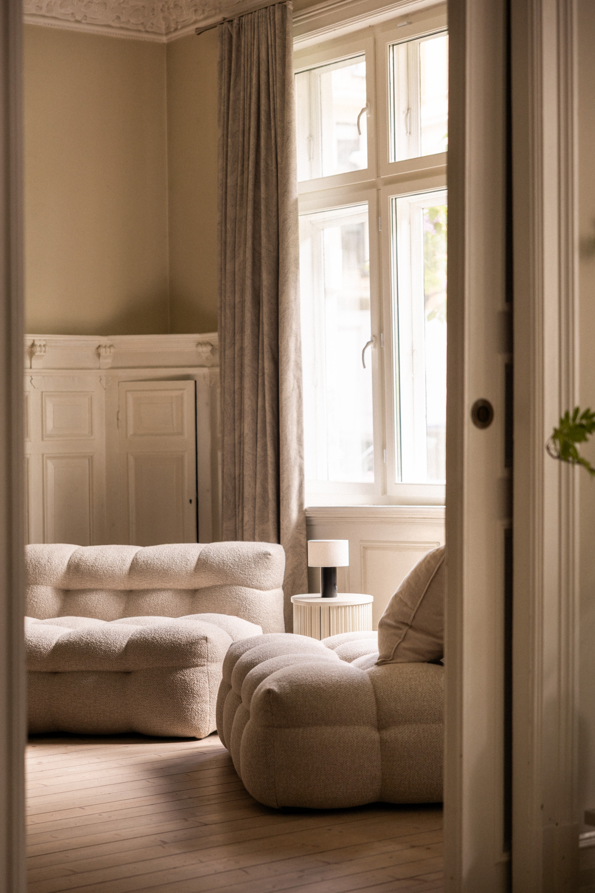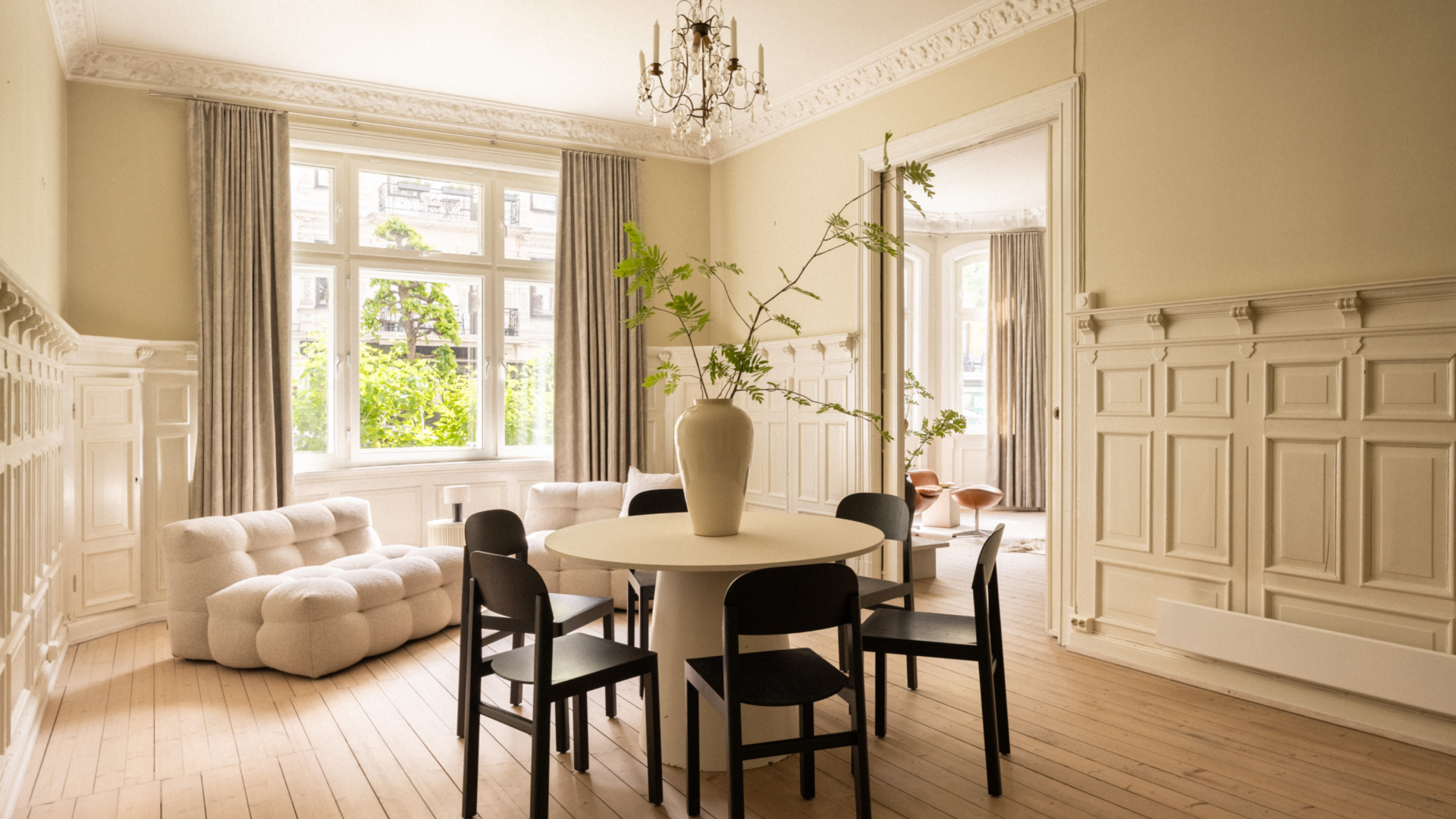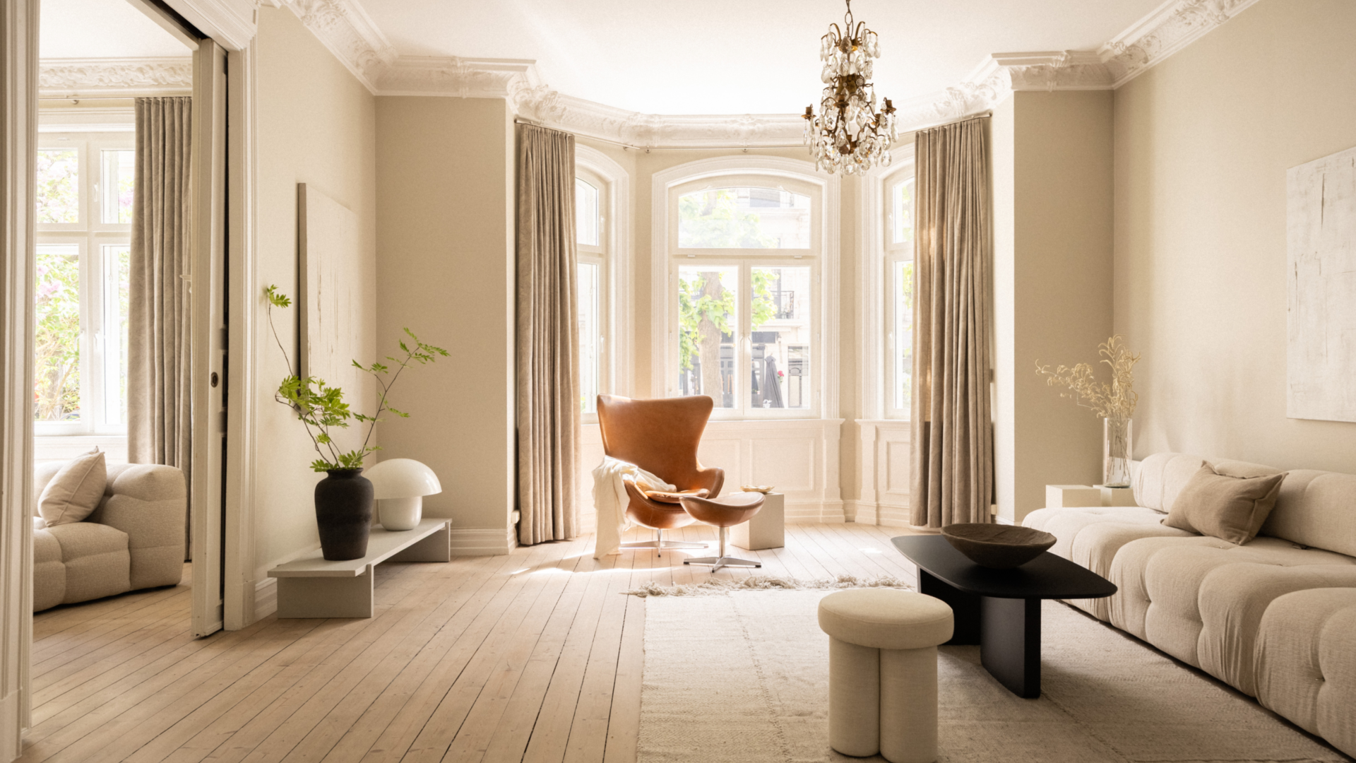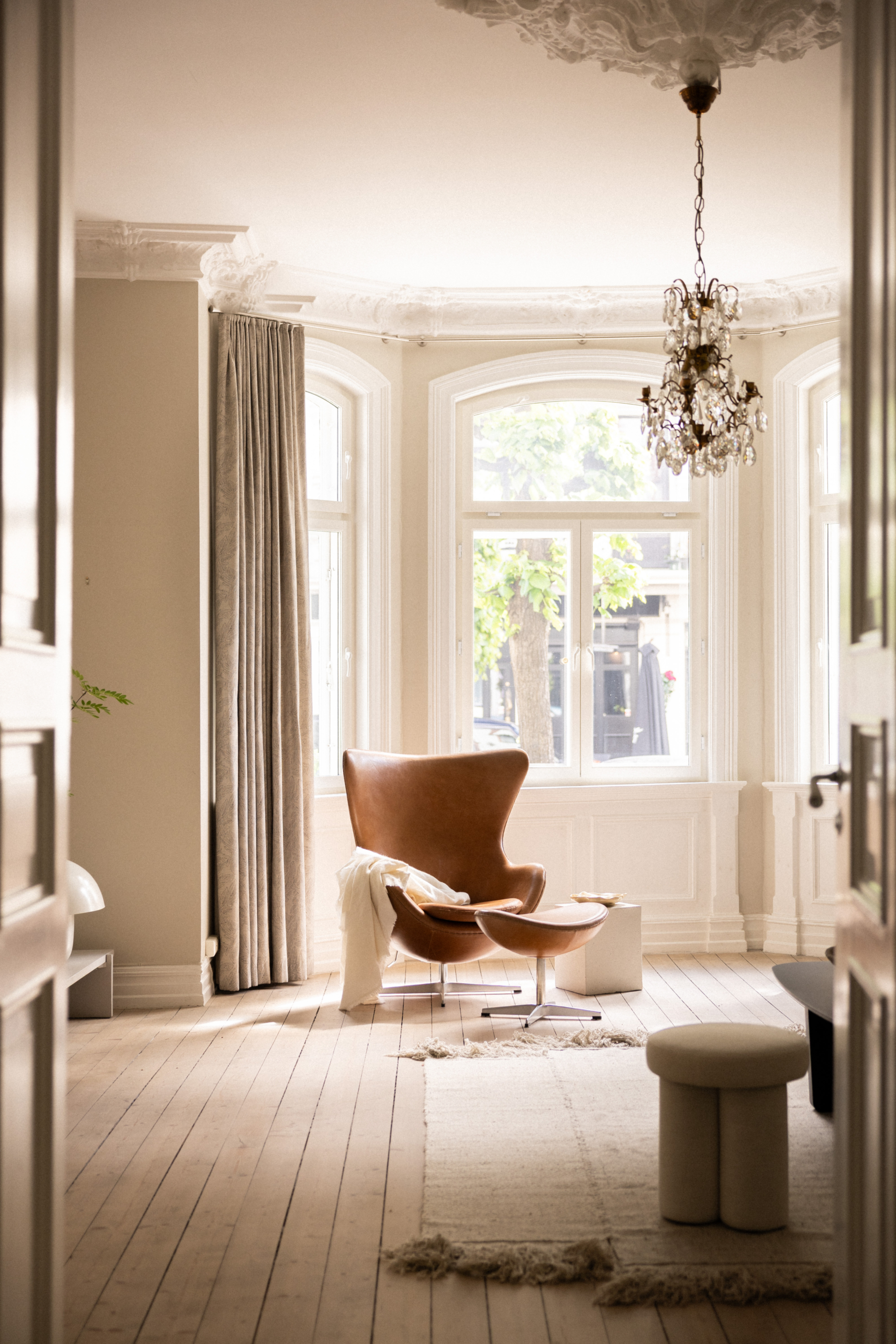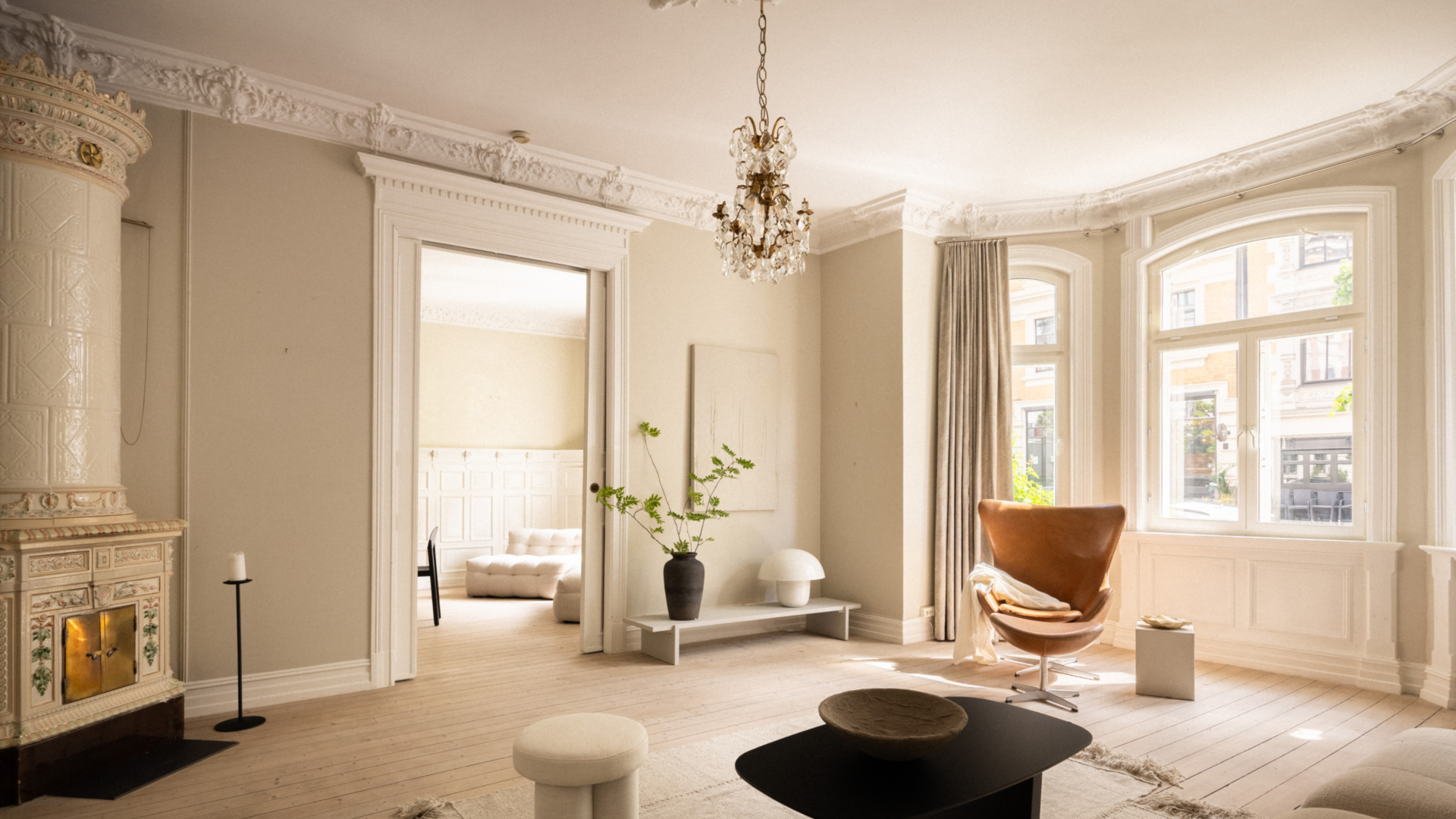 To stuer på rad med doble fløydører åpner seg mot lyset fra de store vinduene, og kakkelovnen i stuen gir hjemmet et behagelig preg som både varmer og begeistrer.